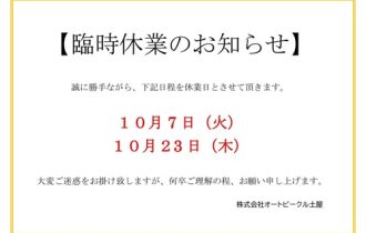 こんにちは!オートビークル土屋 瑞浪本店です。 8月11日(月祝)~8月15日(金)の期間、当店は夏季休業となります。 ご不便をおかけしますがご理解のほど宜しくお願いいたします。 お盆休み中にクルマで遠方に出かける皆様、オイル交換、タイヤ空気圧やバッテリーの点検などは大丈夫でしょうか!?