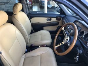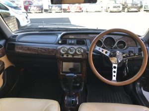 社外新品ウッドステアリング、木目調インパネ、丸型メーター、ホワイトA/Cなど、クラシカルなムードがたっぷり詰まった室内空間です(*^^*)