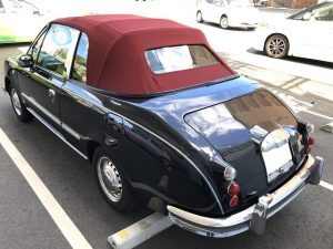 クラシカルなビュートによく似合うボディカラー“ブラック”に“ワインレッドの幌”が