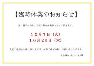 誠に勝手ながら瑞浪本店は10月7日(火)ならびに10月23日(木)を臨時休業とさせていただきます。